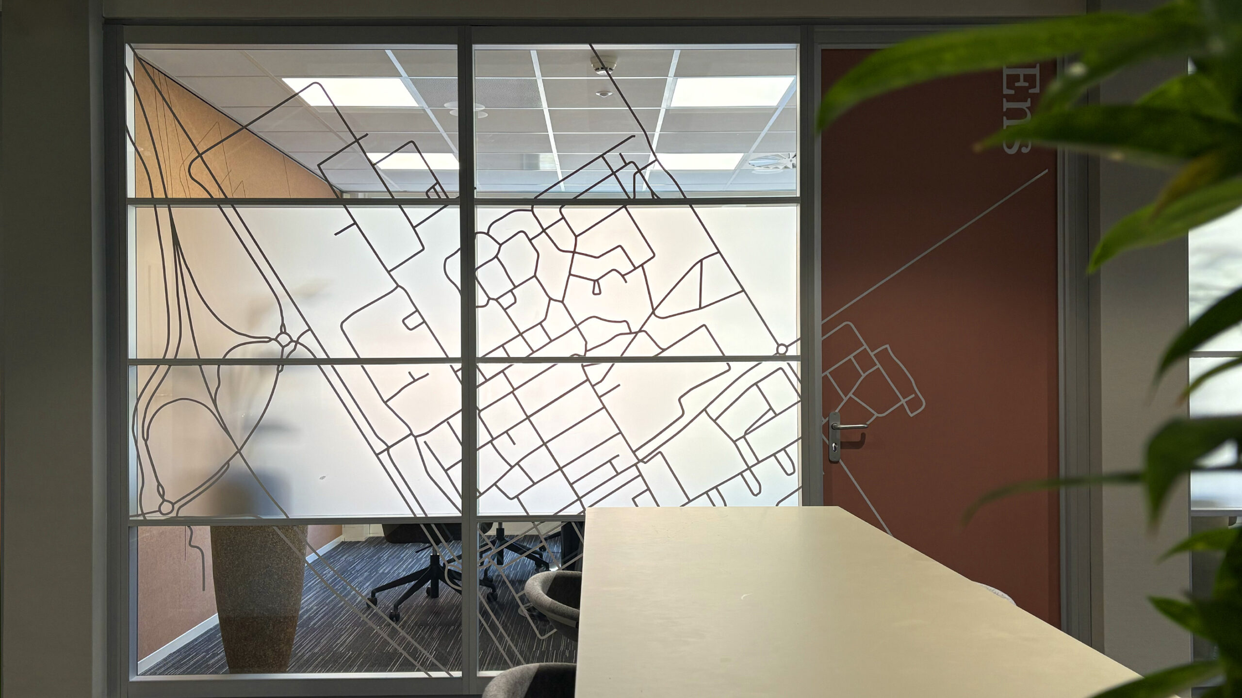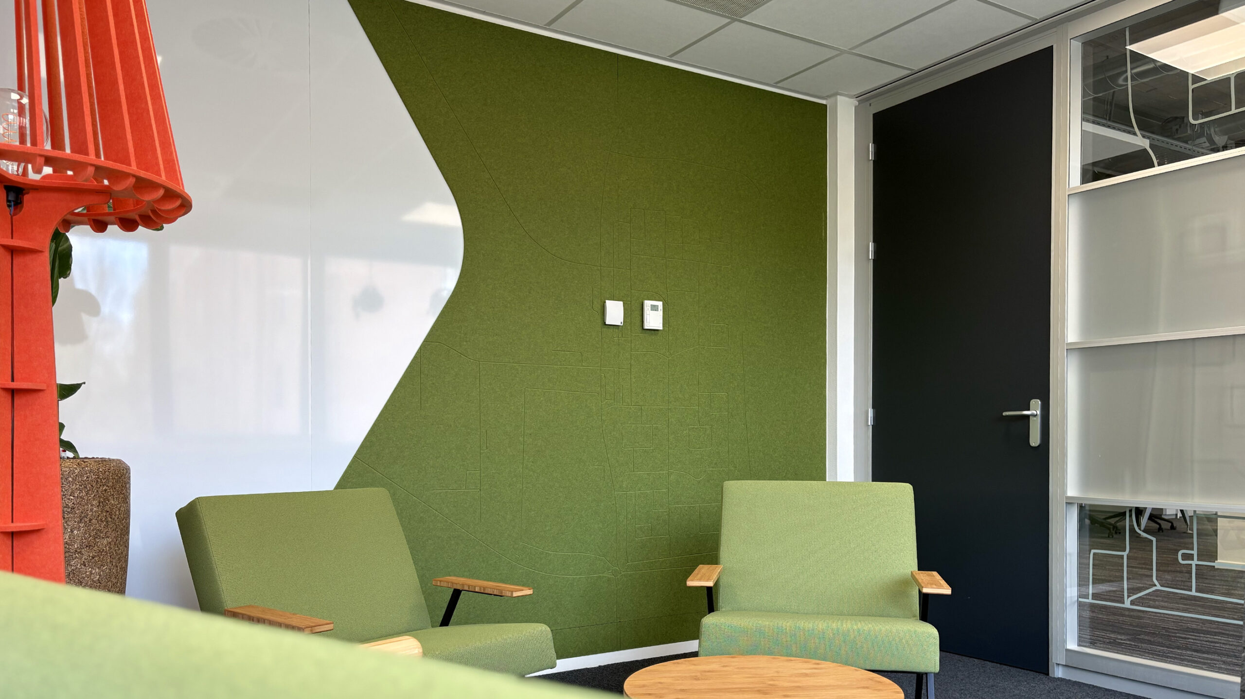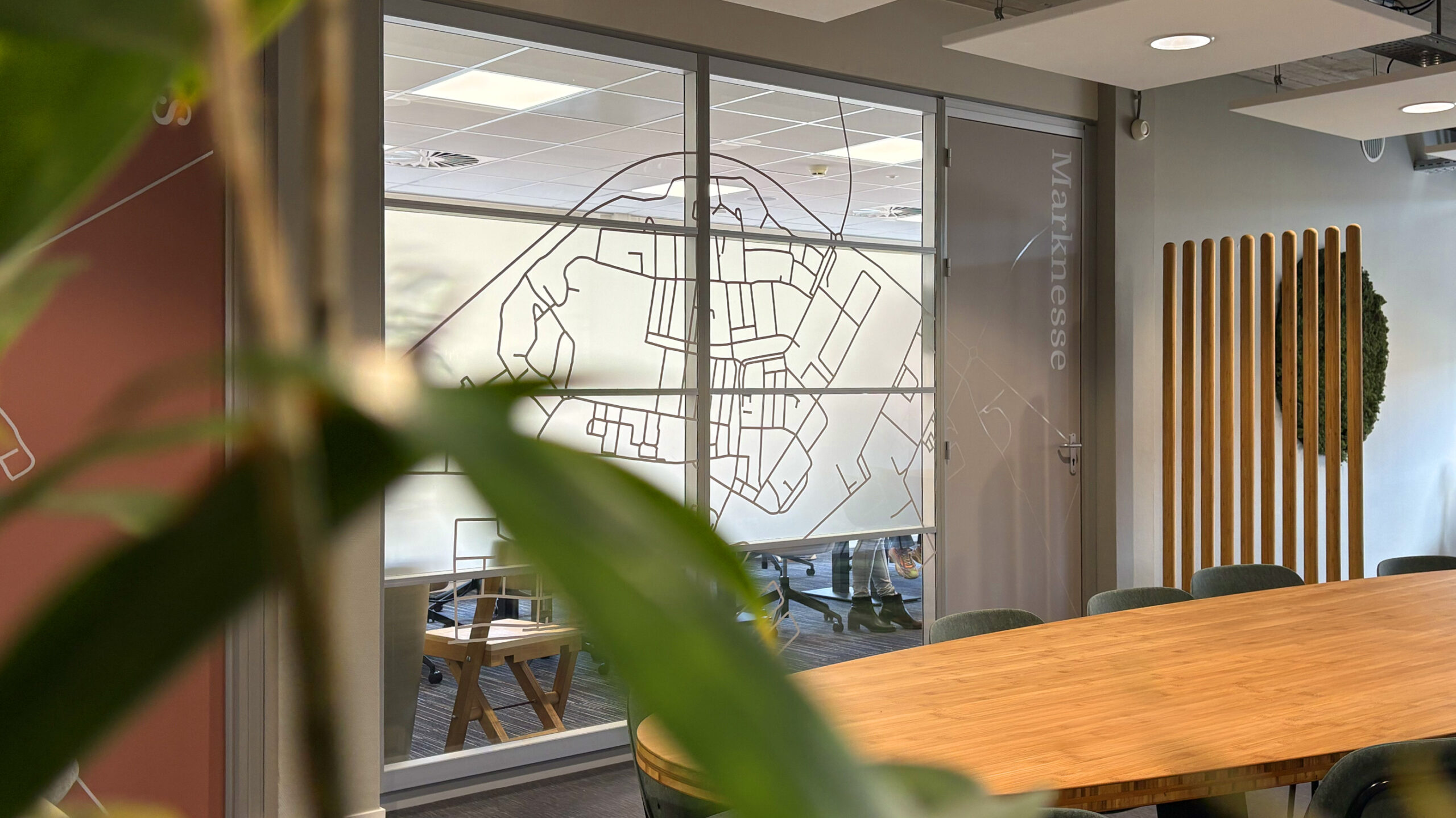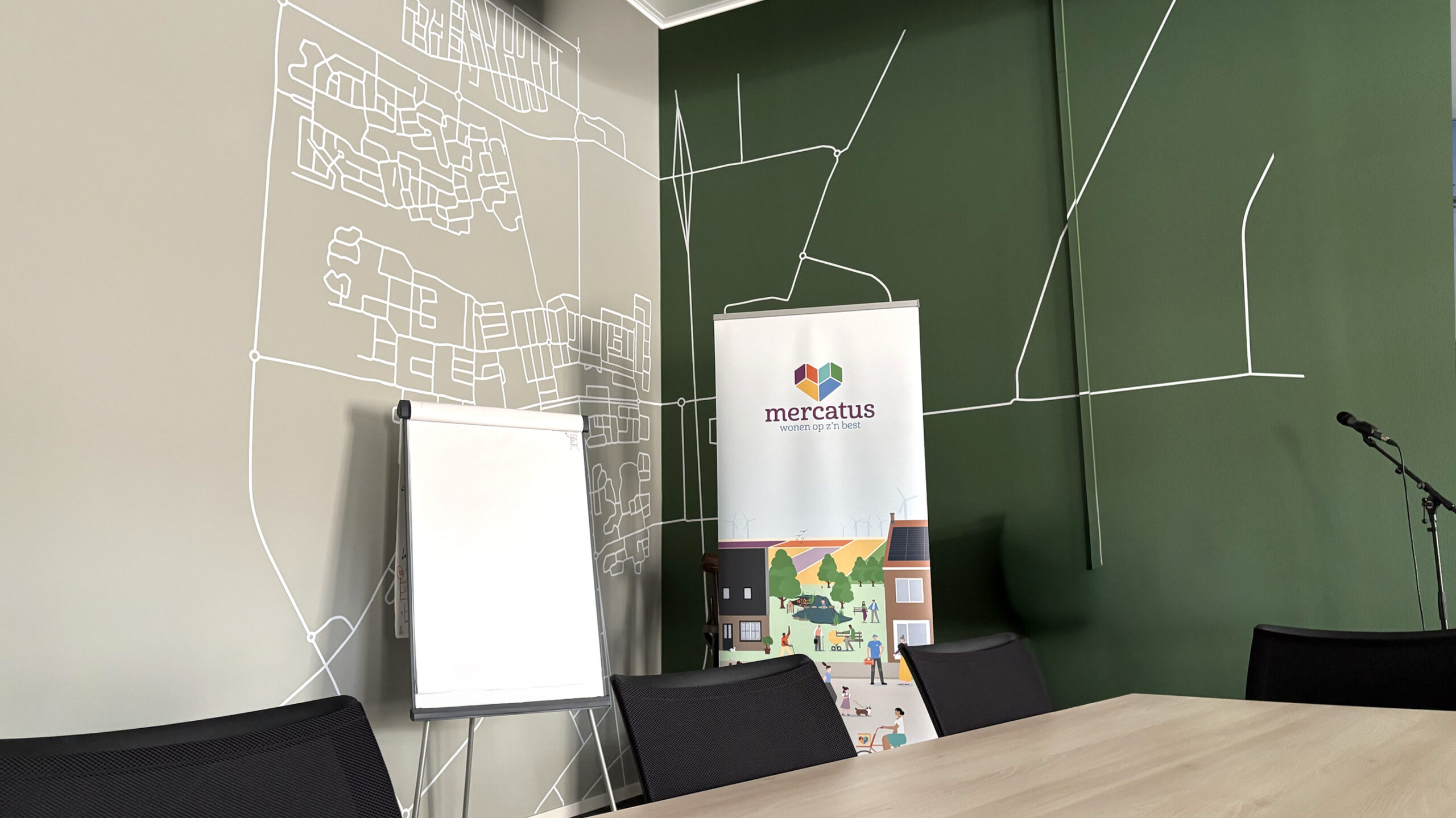 Voor Mercatus Wonen mochten we bijdragen aan een prachtige restyling van het interieur: meer groen, meer duurzaam, meer polder. Elk kantoor kreeg een eigen identiteit, vernoemd naar een plaats in de polder. Deze namen hebben we op een creatieve manier doorvertaald op de muren en ramen. Met duurzame PET-vilt panelen waarin de contouren van de plaatsen zijn uitgefreesd, bijpassende raamstickers, fotowanden en een volledig gewrapte keuken vormt alles één geheel. Het Mercatus-logo hebben we uitgevoerd in acrylox, gecombineerd met echt mos voor een natuurlijke uitstraling. En dankzij one-way vision op de ramen blijft het zicht naar buiten behouden. Een project waar beleving, duurzaamheid en identiteit perfect samenkomen.