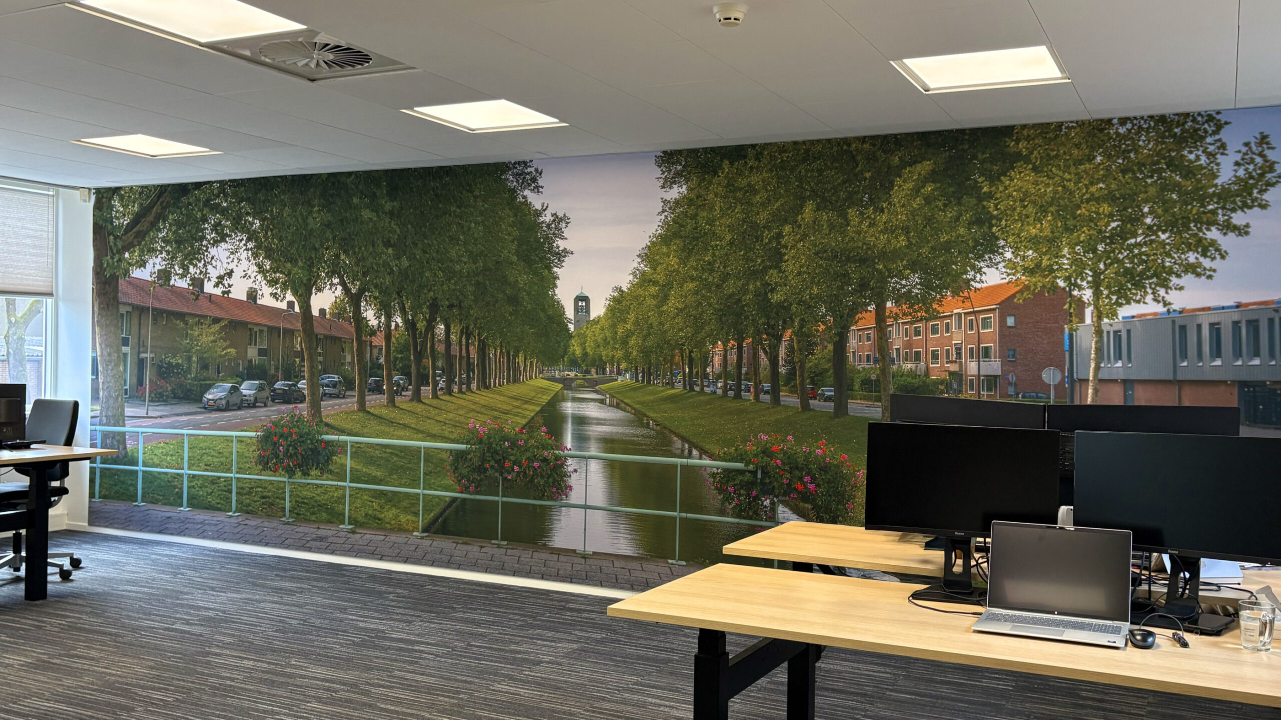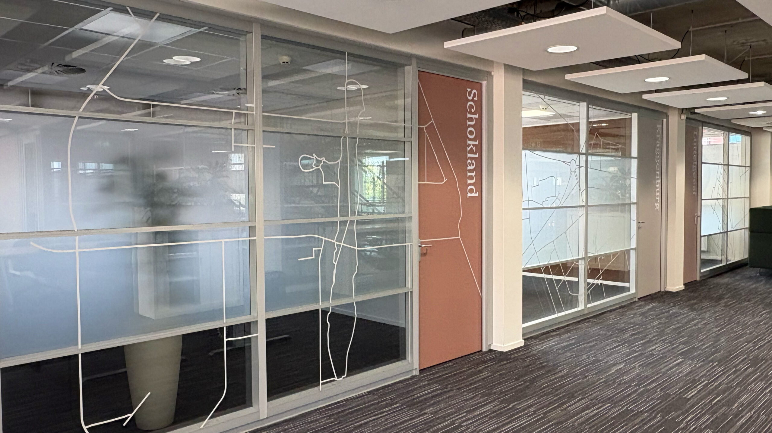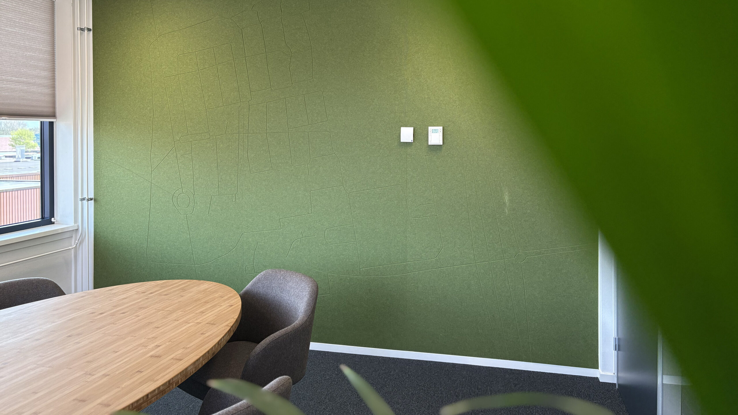 Voor Mercatus Wonen mochten we bijdragen aan een prachtige restyling van het interieur: meer groen, meer duurzaam, meer polder. Elk kantoor kreeg een eigen identiteit, vernoemd naar een plaats in de polder. Deze namen hebben we op een creatieve manier doorvertaald op de muren en ramen. Met duurzame PET-vilt panelen waarin de contouren van de plaatsen zijn uitgefreesd, bijpassende raamstickers, fotowanden en een volledig gewrapte keuken vormt alles één geheel. Het Mercatus-logo hebben we uitgevoerd in acrylox, gecombineerd met echt mos voor een natuurlijke uitstraling. En dankzij one-way vision op de ramen blijft het zicht naar buiten behouden. Een project waar beleving, duurzaamheid en identiteit perfect samenkomen.